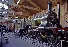 The smaller exhibits were housed in the old station buildings and the rolling stock and other large exhibits in the former locomotive erecting and repair shops of the old York and North Midland Railway (demolished after the museum closed).[36][37][38] Despite this however, the locomotives were displayed on short lengths of track acting as plinths, very much in traditional museum style. It was only when the NRM was formed that Britain acquired a rail-served railway museum where large exhibits could come and go with ease.
