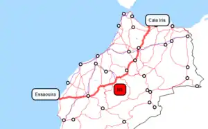 National Route 8 (N8) is a national highway of Morocco. It is one of the most important road networks running through mid-central Morocco. It links with National Route 1 in Inezgane, a southern suburb of Agadir near the Atlantic coast to the central mountainous area of the country. The highway passes through cities such as Chichaoua, Marrakech, Beni Mellal, Khenifra, Fez, and the ski resort in the Atlas Mountains, Ifrane. At Marrakech it connects with the National Route 9.