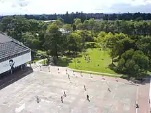 The University City of Bogotá (Spanish: Ciudad Universitaria de Bogotá), also known as the White City (Spanish: Ciudad Blanca), is the flagship University campus. It is located in the Teusaquillo locality, northwest of the historical center. It is also the largest campus in Colombia, with an area of 1,200,000 m2 (300 acres) and a constructed area of 308,541 m2 (76.242 acres), making it an ample campus with several green areas, open spaces, and pedestrian paths. Among its buildings there are 17 which have been declared national monuments and, as a whole, it is a representation of the last 60 years of architecture in Colombia.