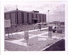 The U.S. Weather Bureau office was moved to 2nd floor of the original Boise Air Terminal Building at Gowen Field on December 19, 1939.[1] All operations at the U.S. Federal building and the old Boise Airport were transferred to the new office by February 20, 1940.[15] In addition to the surface weather observations of temperature, precipitation and wind, Radiosonde observations which began September 1, 1939 at the downtown airport, were moved to a small building north of the Boise terminal building at Gowen Field in 1940.[16] A new balloon inflation building was built east of the terminal in October 1954 with a dome on top to hold the signal receiving equipment.[17] The building was moved to the NIFC campus in August 1969 where it is still being used today.[1] The temperatures and precipitation were taken near the airport terminal building through 1969 though they were moved periodically to accommodate the growing airport. The wind instrument was moved several times through 1969 from the top of the United Hangar to the top of the terminal building to field northwest of the runway. The office remained on the 2nd floor of the terminal building until June 1969.