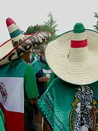 The current national flag was changed from a front-facing to a side-facing position.[1] The current flag is a vertical tricolor of green, white, and red with the national coat of arms charged in the center of the white stripe. While the meaning of the colors has changed over time, these three colors were adopted by Mexico following independence from Spain during the country's War of Independence.