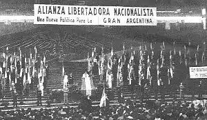 The Nationalist Liberation Alliance (Spanish: Alianza Libertadora Nacionalista, ALN), originally known as the Argentine Civic Legion (Legión Cívica Argentina, LCA) from 1931 to 1937,[1] the Alliance of Nationalist Youth (Alianza de la Juventud Nacionalista, AJN) from 1937 to 1943,[2] and then using its final name from 1943 to 1955, was a Nacionalista and fascist movement.[1]