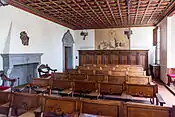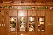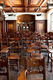 The German Classroom was designed by German-born architect Frank A. Linder to reflect the 16th century German Renaissance as exemplified in the Alte Aula (Great Hall) of the University of Heidelberg. The woodwork of the room was done by German-born Philadelphia decorator Gustav Ketterer and includes walnut paneling framing the blackboards, columns carved with arabesques flanking the two entrance doorways, and support broken-arch pediments surmounted by carved polychromed crests of the two oldest German universities: Heidelberg (1386) and Leipzig (1409). The doors are mounted with ornate wrought-iron hinges and locks, and their upper panels are decorated with intarsia depicting the central square of Nürnberg on the front door and the fountain of Rothenburg on the rear door. Carved in the architrave above the paneling are the names of famous philosophers, poets, musicians, artists, and scientists. The intarsia doors of the four corner cabinets feature tales from German folklore including Parsifal who searched for the Holy Grail, Siegfried who was the hero of the Nibelungenlied, the maiden wooed in Goethe's poem Heidenröslein, and Lorelei who was the golden-haired Rhine maiden whose song lured sailors to destruction. Painted on the escutcheon above the front blackboard are words from Friedrich Schiller's Das Ideal und das Leben, "Stern endeavor, which no arduous task can shake, to the hidden fount of true attains." The rear wall has a quotation from Johann Wolfgang von Goethe's Was wir bringen which reads: "Great mastery results from wise restraint, and law alone points the way to liberty." Furniture includes the professor's leather upholstered chair stands on a small platform behind a burled walnut table and student tablet armchairs are walnut with scroll backs. Wrought-iron chandeliers are the work of German craftsman. The display case contains gifts of artworks and books from Germany's Ministry of Education. The stained-glass windows were designed by master stained glass artist Charles Connick, however they were not completed until 1953 by Connick protege Frances Van Arsdale Skinner.[24] The windows depict characters in the Grimm Brothers' fairy tales such as Little Red Riding Hood, Snow White and the Seven Dwarfs, Hansel and Gretel, and Cinderella.[31]