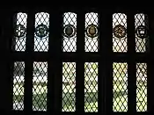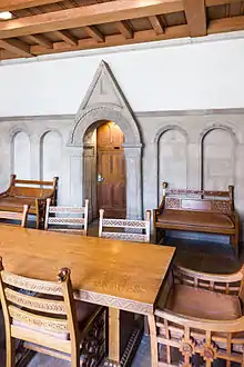 The English Classroom is designed in the Tudor-Gothic style after the House of Commons that was rebuilt by Sir Charles Barry following the fire of 1834. The English Classroom is the largest of the Nationality Rooms and incorporates several original items given as gifts from the British Government from the damaged House of Commons, whose Chamber was completely destroyed, following its bombing by the Luftwaffe in 1941, including the stone fireplace, hearth tiles, linenfold oak paneling, entrance doorframe, lintel, and corbels. The fireplace is from the Commons' "Aye Lobby", so named because members walk through it to vote "yes" to a bill, and is marked with the initials V.R. for Victoria Regina. The cast-iron fireback and andirons commemorate the defeat of the Spanish Armada in 1588 and an inscription above the fireplace is from Shakespeare's King Richard II and uses lettering adapted from the letter tiles originally designed for medieval paving by the Monks of Chertsey Abbey in Surrey. The inscription reads: "Set in the silver sea.....this blessed plot, this earth, this realm, this England." Above the doorway hangs a royal coat of arms made in 1688 during the reign of King James II. The linenfold paneling itself arrived at the University still having a blackened coat from the bombing.[27] Under the ceiling trusses are four carved limestone corbels from the House of Commons that are carved with a Tudor rose. Two corbels remain uncarved to emphasize the original carved corbels. The window frames, set in limestone, are characteristic of the Tudor period, and contain old imported glass, seeded and tinted, and encased in small, diamond-shaped leaded frames. Stained-glass window medallions depict the coats of arms of English towns and cities, literary and political figures, scholars of the Universities of Cambridge and Oxford, and the Houses of Lords and Commons. Portraits of University of Pittsburgh alumnus and former Ambassador to the Court of St. James's, Andrew Mellon, and the former Earl of Chatham, William Pitt, after whom the City was named, flank the stained glass windows in the rear bay. A brick from 10 Downing Street serves as the room's cornerstone. The white oak floor is fitted together with wooden peg dowels. Tudor-Gothic oak benches resemble the old House of Commons benches and are similarly arranged. Two English oak tables with melon-shaped legs stand before the bay. Two House of Commons Library chairs upholstered in green leather and bearing the official gold crest featuring the portcullis and crown were a gift of Lord Alfred Bossom and were rebuilt using wood from actual chairs in the bombed House of Commons.[28][29]