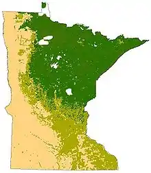 An ecoregion is an area uniquely defined by environmental conditions and natural features. Ecoregions in Minnesota were largely influenced by the unique glacial history, geology, soil type, land use, and climate of the state. The United States Environmental Protection Agency, Minnesota Department of Natural Resources, and World Wildlife Fund maintain separate classifications of the state's ecoregions. Although different, they generally agree on delineating between the coniferous forest in the north-central portion and the Arrowhead, a temperate deciduous forest in the central and southeast, and the tallgrass prairie in the southern and western portions of the state.[1] The northern coniferous forests are a vast wilderness of pine and spruce trees mixed with patchy stands of birch and poplar.