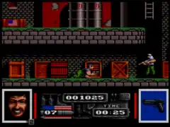 The second level of the game is in Beirut, and focuses on the player, along with a group of Navy Seals, rescuing hostages in a 3D presentation of the city. If the player is successful in rescuing the hostages and recovering all missiles, the remaining forces will rendezvous at a submarine.[4][5] During the game, the player-character may grapple onto ledges, climb ladders, crawl, and jump in any direction.[2] The player can also push large crates in order to reach higher platforms.[6] Combat is focused on shooting an enemy with a weapon on sight, however the player can crawl at any time in order to avoid the oncoming bullets of an enemy.[4][3] The player is also able to neutralise enemies by dropping down onto them whilst dangling from a higher platform.[6] In every level, the game sets a time limit when a bomb is placed on one of the crates containing Stinger missiles.[2][6]