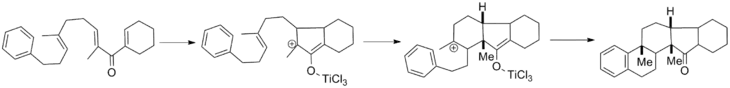 - Bender, J.A.; Arif, A.M.; West, F.G. (1999), "Nazarov-Initiated Diastereoselective Cascade Polycyclization of Aryltrienones", J. Am. Chem. Soc., 121 (32): 7443–7444, doi:10.1021/ja991215f