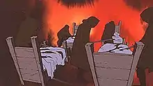 In the Rankin-Bass adaptation of The Return of the King, the Nazgûl are robed skeletons with white hair. They ride winged horses, although the Witch-king rides a creature more in line with the book when he confronts Éowyn.[18] The 1981 BBC Radio serial of The Lord of the Rings has the Nazgûl chant the Ring-inscription in the Black Speech of Mordor.[19] The 1991 Russian television play Khraniteli features a group of Nazgûl galloping through a snowy pine forest; they wear black cloaks, with glimpses of red equipment.[20]