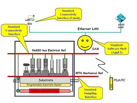 To date, NeSSI has served as a forum for the adoption and improvement of an industrial standard which specifies the use of miniature and modular Lego-like flow components. NeSSI has also issued a specification which has been instrumental in spurring the development and commercialization of a plug and play low power communication bus (NeSSI-bus) specifically designed for use with process analytical sample systems in electrically hazardous environments. As part of its development road map, NeSSI has defined the electrical and mechanical interfaces, as well as compiled a list of automated (smart) software features, which are now beginning to be used by microAnalytical manufacturers for industrial applications.