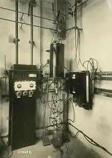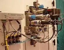 The hardware (traditionally metal tubing, compression fittings, valves, regulators, rotameters and filters) associated with extractive sampling is collectively referred to as the sampling system. Sample systems are used to condition or adjust the sample conditions (pressure, amount of particulate allowed, temperature and flow) to a level suitable for use with an analytical device (analyzer) such as a gas chromatograph, an oxygen analyzer or an infra red spectrometer. Despite the simple explanation just given, modern sampling systems can be quite large, complex, and expensive. The design features of analytical sample systems have changed little, when the discipline of Process Analytics began in Germany, right through until the present day. An example of an early analyzer and sample system used at the Buna Chemical Works (Schkopau, Germany), is shown in the following photograph. Process analytics remains exceptional in the fact that it is the last outpost of low level automation (retains manual adjustments and visible checks) within the process industries.