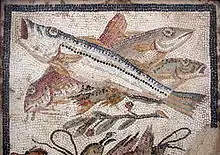 Neapolitan cooking has always used an abundance of all kinds of seafood from the Tyrrhenian sea. Dr Johnson's friend Hester Thrale was enthusiastic for "the most excellent, the most incomparable fish I ever ate; red mullets large as our mackerel, and of singularly high flavour; beside calamaro or ink-fish, a dainty worth of imperial luxury".[4] In 1759, when Ferdinando Galiani was sent as secretary to the Neapolitan ambassador in Paris, he pined for familiar foods; he found "no fruit, no cheese, no good seafood— everything here does violence to the Neapolitan temperament".[5] Recipes use either less expensive fishes, in particular anchovies, and other fishes, like the ones used to prepare the zuppa: scorfano (Scorpaena scrofa), tracina (Trachinus draco), cuoccio (Triglia lanterna), or fishes of medium and large size, like spigola (European seabass) and orate (gilt-head bream), presently sold mainly from fish farms, or like dentice (Dentex dentex), sarago (Diplodus sargus sargus) and pezzogna (Pagellus bogaraveo). Fishes of very small size are also used: