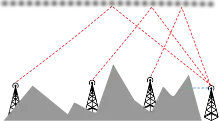 Near vertical incidence skywave, or NVIS, is a skywave radio-wave propagation path that provides usable signals in the medium distances range — usually 0–650 km (0–400 miles). It is used for military and paramilitary communications, broadcasting,[1] especially in the tropics, and by radio amateurs for nearby contacts circumventing line-of-sight barriers. The radio waves travel near-vertically upwards into the ionosphere, where they are refracted back down and can be received within a circular region up to 650 km (400 miles) from the transmitter.[2] If the frequency is too high (that is, above the critical frequency of the ionospheric F layer), refraction is insufficient to return the signal to earth and if it is too low, absorption in the ionospheric D layer may reduce the signal strength.