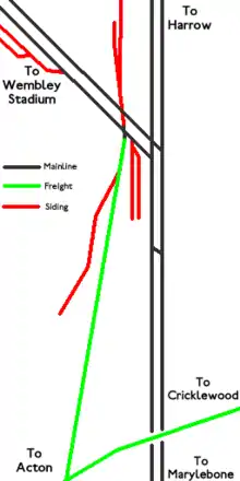 Just south-east of the mainline junction the freight line (Dudding Hill Line) from Acton splits into two, one line continuing onwards north-east to Cricklewood and the other joining the Chiltern Main Line westbound. There are a few sidings for freight and maintenance trains. There used to be a locomotive shed but this was knocked down during the 1960s.[1] The Metropolitan line and Jubilee line run east of the junction and Neasden Underground station also lies east to the junction. The North Circular Road goes over the junction using a Victorian bridge.