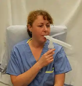 The most commonly used nebulizers are jet nebulizers, which are also called "atomizers".[10] Jet nebulizers are connected by tubing to a supply of compressed gas, usually compressed air or oxygen to flow at high velocity through a liquid medicine to turn it into an aerosol that is inhaled by the patient. Currently there seems to be a tendency among physicians to prefer prescription of a pressurized Metered Dose Inhaler (pMDI) for their patients, instead of a jet nebulizer that generates a lot more noise (often 60 dB during use) and is less portable due to a greater weight. However, jet nebulizers are commonly used in hospitals for patients who have difficulty using inhalers, such as in serious cases of respiratory disease, or severe asthma attacks.[11] The main advantage of the jet nebulizer is related to its low operational cost. If the patient needs to inhale medicine on a daily basis the use of a pMDI can be rather expensive. Today several manufacturers have also managed to lower the weight of the jet nebulizer to 635 grams (22.4 oz), and thereby started to label it as a portable device. Compared to all the competing inhalers and nebulizers, the noise and heavy weight is still the biggest draw back of the jet nebulizer.[12]