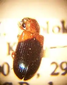 Necrobia ruficollis, the ham beetle,[1] red-shouldered ham beetle, or red-necked bacon beetle,[2] is a mostly carnivorous beetle in the family Cleridae with a cosmopolitan distribution.[1]
