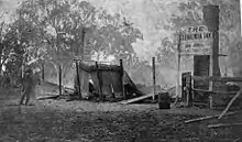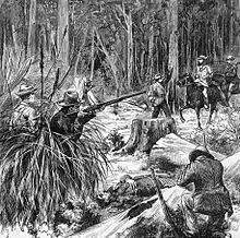 The police had received information that the Kelly gang were in the Wombat Ranges, at the head of the King River and, on 25 October 1878, two mounted police parties were dispatched to search for them. One party, consisting of Sergeant Michael Kennedy and constables Michael Scanlan (sometimes spelled Scanlon), Thomas Lonigan and Thomas McIntyre camped overnight in an abandoned mining site at Stringybark Creek, about 25 miles north of Mansfield.[47] They were unaware that they were only 1.5 miles from the Kelly gang's hideout[48] and that Ned Kelly had observed their tracks.[47]