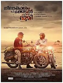 Neelakasham Pachakadal Chuvanna Bhoomi (transl. Blue Sky, Green Sea, Red Earth) is a 2013 Indian Malayalam-language road adventure film directed and co-produced by Sameer Thahir and written by Hashir Muhammad. The film stars Dulquer Salmaan and Sunny Wayne with Dhritiman Chatterjee, Surja Bala Hijam in supporting roles. The movie was inspired from the book Long Way Down . The movie was a hit at the Kerala box office and has since developed a cult following among the youth of Kerala.[1] The film began shooting in the north-eastern state of Nagaland in February 2013 and completed its shoot in June 2013.[2] The film was shot at real locations in eight Indian states, Kerala, Karnataka, Andhra Pradesh, Tamil Nadu (Tirunelveli Highway) Odisha, West Bengal, Nagaland and Sikkim.[3]
