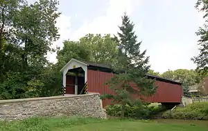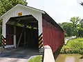 The bridge has a single span, wooden, double Burr arch trusses design with the addition of steel hanger rods. The deck is made from oak planks.[2] It is painted red, the traditional color of Lancaster County covered bridges, on both the inside and outside. Both approaches to the bridge are painted in the traditional white color. It is purportedly the narrowest covered bridge in the county.[3][4]
