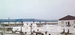 Large-scale construction started on the settlement in 1958, which included nine-story hostels, hotels, cultural palaces, bakery factories and lemonade workshops.[8] The mass development of Neft Daşları continued during 1976–1978 with the building of a five-story dormitory and two oil-gas compressor stations, the installation of a drinking water facility, and the construction of two underwater pipelines to the Dubendi terminal, each with a diameter of 350 millimetres (14 in).[8] In addition, a flyover for vehicular traffic was created.[8] As a result, the area of the settlement grew to around 7 ha in the 1960s, with the length of the steel trestle bridges joining the man-made islands exceeding 200 kilometres (120 mi).[12]