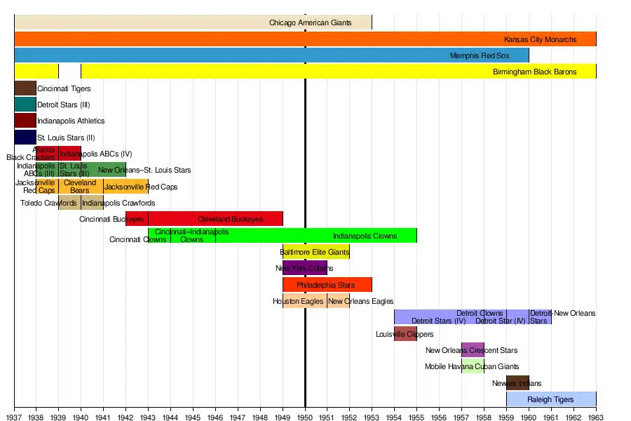 - 1937: Formation of NAL consisting of 8 teams — Birmingham Black Barons, Chicago American Giants, Cincinnati Tigers, Detroit Stars (III), Indianapolis Athletics, Kansas City Monarchs, Memphis Red Sox and St. Louis Stars (II).