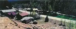In 1882, the town was large enough for the United States Post Office Department to establish a post office there.[4] A road to White Sulphur Springs was constructed shortly thereafter, although ore was packed out by mule to Barker and smelted there.[4][18] When the Barker smelter closed in 1883, a new smelter was built close to Neihart at the Mountain Chief Mine in 1885.[19] By this time, the town featured a blacksmith's shop, a boarding house, restaurants, two saloons, and stables.[19] About 50 houses had been built in Neihart, although many residents still lived in tents.[19] From 1882 to 1929, about $16 million in silver was taken out of the area around Neihart.[3][19] The Galt and Broadwater mines were dug in 1883, and a year later the Ball and Mountain Chief mines were in operation.[20] The M and I, Rochester, and Silver Dyke mines also opened near Neihart.[9] Despite the area's rich ore deposits, investment in mining in the Neihart region remained low due to ore extraction being regarded as expensive.[19][21] In 1887, these early mines largely shut down, as most of the richest and easily accessible veins of ore had been exhausted.[21] By 1890, Neihart was almost deserted.