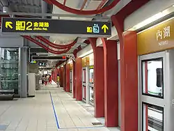 The Taipei Metro Neihu station (Chinese: 內湖站; pinyin: Neìhú Zhàn; Pe̍h-ōe-jī: Lāi-ô͘ Chām) is located in the Neihu District in Taipei, Taiwan. It is a station on Wenhu line.