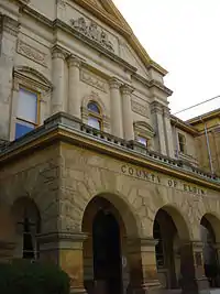 Simplicity of form and emphasis on symmetry using a central hall plan characterizes most of Darrach's buildings .[5] Darrach's first building was designed in 1879. This was the Centre Street Baptist Church in St. Thomas, one of many church designs to follow.[6] Neil would also work on the First United Church, the Grand Central Hotel (subsequently destroyed in the later 20th century), St. Thomas Masonic Hall, Myrtle and Balaclava Street Schools; and several prominent homes in the community in addition to the heritage buildings described below.[6][7] In 1898 disaster struck the Elgin County Courthouse (which was originally designed in 1854 by John Turner) where a significant portion of the building was destroyed by fire. Darrach was retained to re-design the building and did so under the present Palladian style. The building is still in use today and recently received a government grant of over 100 million dollars for renovations.[8] Perhaps one of Neil's more prominent constructions was the design of the St. Thomas City hall in 1898–99. Darrach's design was chosen out of 10 applications submitted.[5] The building was designed in the late Richardsonian Romanesque[2] style. Subsequently in 1903, Neil was retained to design the City Public Library. This was achieved through Neoclassical Revival style (which now serves as a municipal building extension)adjacent to the city hall.[2] the building was largely paid for by a Carnegie Foundation grant.[9] Other designated heritage properties designed by Darrach include; the late Victorian building the Southern Loan Building[2] which still has 16 functioning vaults, The Princess Avenue Play House (once a church, now a theatre) built in 1907. Despite the catalogue of buildings that are known to be built by Darrach, there is often controversy surrounding the history of some other buildings of historical value in the city which are sometimes argued to be designed by Neil. Over 24 buildings in St. Thomas are known to be designed by Neil.[7]