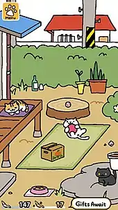 In version 1.5.5, there is a chance that the player's yard will be covered in snow.[14] The snow event typically lasts for 24 hours and changes the appearance of the yard as well as the background music. The player also has the opportunity to get a new rare cat, Frosty. Version 1.6.0 was released on March 24, 2016. This version added two new common cats and two new rare cats, more toys, and introduced the "gallery" where players can buy wallpapers for their phones with gold fish.[15] Version 1.7.0 was released on July 14, 2016. This version added three more cats (two common and one rare), more toys, and more wallpapers. Version 1.8.0 was released on October 13, 2016. This version added two new common cats, more toys, and a new remodel. Version 1.9.0 was released on December 15, 2016. This version added new toys, one rare cat, and enabled snow days like version 1.5.5.[16] Version 1.10.0 was released on July 20, 2017. This version added two new common cats, a rare cat, and more toys. Version 1.11.0 was released on December 22, 2017. This version added one new common cat and more toys.