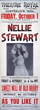When the Duke and Duchess of York came to Australia to open the first federal parliament, Stewart sang the ode "Australia" at the beginning of the musical programme.[11] In February 1902 she had one of the greatest parts in her career, Nell Gwynne in Sweet Nell of Old Drury.[9] She became known as "Our Nell" and "Sweet Nell".[12] Other comedy parts followed in Mice and Men and Zaza. It was in the last play that Stewart reached her largest salary, £80 a week.