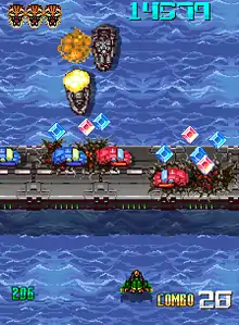 During gameplay, power-up items are drop randomly from enemies and certain setpieces, along with medals to build up a chain.[1][3] Every time the player collects a medal, the next one that spawns will be worth more but if a medal falls off the screen, the next one to spawn will be of the lowest value and breaking the chain; however, the player can activate a bomb to fling falling medals from reaching the bottom of the screen.[4] The player has only two weapons at their disposal: the main gun that travels a max distance of the screen's height and a bomb capable of obliterating any enemy caught within its blast radius, while more bombs are obtained by collecting six fragments through levels or a full bomb stock.[1][2][8] The player can also slowdown the ship's movement to avoid incoming bullets more precisely by pressing the C or R button in the Neo Geo and Dreamcast versions respectively.[1][2][8] If both fire and slowdown buttons are held down, the ship produces a focused vertical shot, providing more firepower than the standard shot.[8] Getting hit by enemy fire will result in losing a life, as well as a penalty of decreasing the ship's firepower and once all lives are lost, the game is over unless the player inserts more credits into the arcade machine to continue playing but in the Dreamcast version, the player are forced to restart from the beginning after losing all available continues.[1]