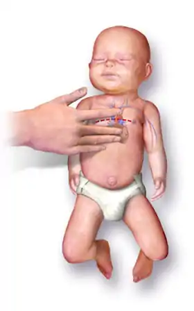 Neonatal resuscitation, also known as newborn resuscitation, is an emergency procedure focused on supporting approximately 10%[1] of newborn children who do not readily begin breathing, putting them at risk of irreversible organ injury and death. Through positive airway pressure, and in severe cases chest compressions, medical personnel certified in neonatal resuscitation can often stimulate neonates to begin breathing on their own, with attendant normalization of heart rate.[2]