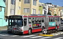 The San Francisco Municipal Railway (Muni) began taking delivery of 230 Neoplan USA buses in April 2000, equipped with cleaner-burning diesel engines.[42] Residents complained about the noise from engine cooling system and called the new buses "screaming banshees", with tests showing noise levels of 88 to 90 dB, exceeding the 83 dB contract requirement. The engine cooling fan was modified and sound-deadening material was added to reduce noise.[43] The original fans also proved to provide inadequate engine cooling, requiring the installation of electric fans, consuming 32 labor hours per bus.[44] By the end of 2001, the Neoplan USA buses for Muni were breaking down, with one driver declaring that "every one of those buses is a piece of garbage" and up to two per day required towing back to the bus yards.[45]