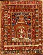Mithila Painting is practiced in the Mithila region of Nepal and India. This tradition dates back to country the 7th century AD. Mithila painting is done with twigs, fingers, natural dyes and pigments. Artists make pictures of natural objects like sun, moon, and deities from mythological epics, royal courts, and weddings.[4] Researchers have discovered much Buddhist art in caves of Mustang area which dates back to 12 century or earlier.[5] Style, technique, materials and subject of painting differed with the ethnic origin of the artists. Artists from the Newar community made most of the paintings that illuminated Buddhist manuscripts and book covers as well as devotional paintings on cloth. Newari artists were renowned throughout Asia for the high quality of their workmanship.[1] Newari painting style 'Beri' was famous in Tibet. Beri was adopted as Tibet’s universal painting style in the 14th century.[6]