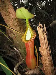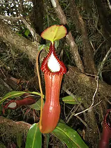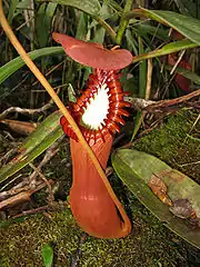 The pitcher base is bulbous to ovoid, with the pitcher cup becoming cylindrical in the upper two-thirds to three-quarters. The pitchers are some of the largest in the genus, sometimes exceeding 50 cm in height and 15 cm in width,[5] although they are usually around 30 cm high.[34] Wings at the front of the pitcher cup are either greatly reduced or absent altogether. On the inner surface of the pitcher, the glandular region is present in the bulbous portion. The mouth is elongated into a neck and has an oblique insertion. The peristome is cylindrical and up to 30 mm wide. It bears very highly developed teeth and ribs, the latter reaching 20 mm in diameter.[34] The pitcher lid or operculum is cordate, up to 8 cm wide,[27] and lacks appendages. An unbranched spur up to 20 mm long is inserted near the base of the lid.[5] Pitchers range in colour from light yellow to dark red.[34][35] The inner surface of the pitcher is usually white, contrasting sharply with the rich colouration of the outer surface. Most parts of the pitcher are very flexible, including the peristome ribs, with only the pitcher base, where the digestive zone is located, being rigid.[36][37]