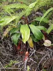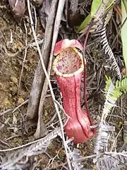 Rosette and lower pitchers are ovoid in the lowermost quarter and cylindrical above, frequently widening just below the peristome. They are up to 20 cm high and 4 cm wide. On the inner surface, the glandular region covers the ovoid portion of the pitcher cup. The pitchers lack wings, bearing a pair of ribs instead. The pitcher mouth is round and has an oblique insertion. The flattened peristome may be up to 5 mm wide. Its inner margin is lined with indistinct teeth.[12] The inner portion of the peristome accounts for around 29% of its total cross-sectional surface length.[17] The lid is sub-orbicular and lacks appendages. The spur is up to 4 mm long and generally bifid.[12]