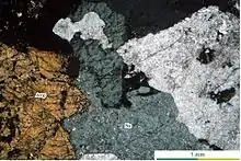 Nepheline syenite is a holocrystalline plutonic rock that consists largely of nepheline and alkali feldspar.[1] The rocks are mostly pale colored, grey or pink, and in general appearance they are not unlike granites, but dark green varieties are also known. Phonolite is the fine-grained extrusive equivalent.