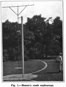 Developed by Louis Besson in 1912, this apparatus consists of a horizontal bar fitted with several equidistant spikes and mounted on the upper end of a vertical pole which can be rotated on its axis.[1] When an observation is to be made, the observer places himself in such a position that the central spike is projected on any chosen part of a cloud. Then, without altering his position, he causes the "comb" to turn by means of two cords in such a manner that the cloud is seen to follow along the line of spikes. A graduated circle, turning with the vertical pole, gives the direction of the cloud's motion.