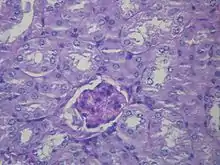 | Microscopic image of diabetic glomerulosclerosis, the main cause of nephrotic syndrome in adults. | |