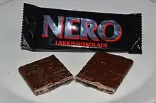 Nero is a chocolate- and liquorice-based candy bar made by Nidar AS of Trondheim, Norway. It consists of a liquorice-flavoured jelly with additional aniseed and fennel oil flavourings, covered in a layer of 45%-cacao dark chocolate.