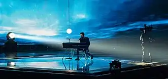 The live performance features Laurence dressed in blue and playing an electric piano alone on stage with a single spotlight focused on him. He said it was to re-create the emotions and feelings he had when he first wrote the song.[20] The backdrop consisted of blue atmospheric visuals similar to those of the music video, with a white light descending from the ceiling during the second chorus and bridge to symbolize the hope he lost and sought to find again.[21] Offstage backing vocals were provided by Kris Rietveld, Marcel Swerissen and Sarina Voorn.