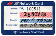 The Network SouthEast brand was introduced to what had been the London & South East sector of British Rail on 10 June 1986. The railcard was then introduced on 29 September 1986,[1] under the name Network Card. It offered a 34% discount on all off-peak fares for journeys wholly within the Network SouthEast area. Tickets valid at peak times, such as Day Returns and Open Returns, were excluded, as were First Class tickets (however, a supplement ticket could be bought to upgrade a discounted Standard Class ticket to First Class at weekends).[1] On weekdays, journeys had to start after 10.00am, but there were no time restrictions at weekends or on Bank Holidays. Up to three adults could accompany the railcard holder and gain the same discount, while up to four accompanying children could travel for a £1.00 flat fare. This version of the railcard could be issued for either one person or two people. On a two-person "joint-holder" ticket, either or both of the named holders could travel - that is, the card was transferable between the two.[2]