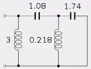 The rightmost term is the extracted resonant circuit with and .[78] The network synthesised so far is shown in the figure.