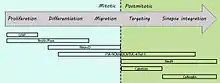The standard method of isolating neural stem cells in vitro is with the neurosphere culture system, the method originally used to identify NSCs. After some proliferation, the cells are either induced to differentiate by withdrawing the mitogens or by exposing the cells to another factor that induces some of the cells to develop into different lineages.[18] Cellular fates are analysed by staining with antibodies directed against antigens specific for astrocytes, oligodendrocytes, and neurons. In some cases, cells are plated at low density and monitored to determine if a single cell can give rise to the three phenotypes.[19] Immunomagnetic cell separation strategies using antibodies directed against cell surface markers present on stem cells, progenitors and mature CNS cells have been applied to the study of NSCs. Other non-immunological methods have been used to identify populations of cells from normal and tumorigenic CNS tissues, which demonstrate some of the in vitro properties of stem cells, including high aldehyde dehydrogenase (ALDH) enzyme activity. ALDH cells from embryonic rat and mouse CNS have been isolated and shown to have the ability to generate neurospheres, neurons, astrocytes and oligodendrocytes in vitro, as well as neurons in vivo when transplanted into the adult mouse cerebral cortex.[18] Once a stem cell divides asymmetrically, the more mature progenitor is born and migrates to regions of differentiation. As the progenitor migrates, it matures further until it reaches a site where it stops and either becomes quiescent or fully differentiates into a functioning cell. The major obstacle to identifying and discovering markers that define a stem cell is that the most primitive cells are probably in a quiescent state and do not express many unique antigens. Thus, as with other fields like haematopoiesis, a combination of positive and negative markers will be required to better define the central nervous system stem cell.[19] Nonetheless, changes in the expression levels of specific molecules can be used to indicate the presence of neural stem cells in studies focused on further differentiation toward specific neural lineages. Usual markers used for neural stem cells include Nestin and SOX2. Although Nestin it is expressed predominantly in stem cells of the central nervous system (CNS), its expression is absent from nearly all mature CNS cells, thus it is an efficient marker for neural stem cells.[20] During neurogenesis, Sox2 is expressed throughout developing cells in the neural tube as well as in proliferating CNS progenitors, hence is thought to be centrally important for neural stem cell proliferation and differentiation.[20] In addition to intracellular molecules, products are available to study proteins which are expressed at the cell surface, including ABCG2, FGF R4, and Frizzled-9.
