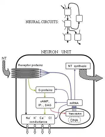 The more recent advances involve understanding at the organic molecular level; biochemical action of the endogenous ligands, enzymes, receptor proteins, etc. The critical changes affecting cell firing occur when the signalling neurotransmitters from one neuron, acting as ligands, bind to receptors of another neuron. Many neurotransmitter systems and receptors are well known, and research continues toward the identification and characterization of a large number of very specific subtypes of receptors. For the six more important neurotransmitters Glu, GABA, Ach, NE, DA, and 5HT (listed at neurotransmitter) there are at least 29 major subtypes of receptor. Further "sub-subtypes" exist together with variants, totalling in the hundreds for just these 6 transmitters. - (see serotonin receptor for example.) It is often found that receptor subtypes have differentiated function, which in principle opens up the possibility of refined intentional control over brain function.