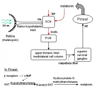 Circadian rhythm, or sleep/wake cycling, is centered in the suprachiasmatic nucleus (SCN) within the hypothalamus, and is marked by melatonin levels 2000–4,000% higher during sleep than in the day. A circuit is known to start with melanopsin cells in the eye which stimulate the SCN through glutamate neurons of the hypothalamic tract. GABAergic neurons from the SCN inhibit the paraventricular nucleus, which signals the superior cervical ganglion (SCG) through sympathetic fibers. The output of the SCG, stimulates NE receptors (β) in the pineal gland which produces N-acetyltransferase, causing production of melatonin from serotonin. Inhibitory melatonin receptors in the SCN then provide a positive feedback pathway. Therefore, light inhibits the production of melatonin which "entrains" the 24-hour cycle of SCN activity. The SCN also receives signals from other parts of the brain, and its (approximately) 24-hour cycle does not only depend on light patterns. In fact, sectioned tissue from the SCN will exhibit daily cycle in vitro for many days. Additionally, (not shown in diagram), the basal nucleus provides GABA-ergic inhibitory input to the pre-optic anterior hypothalamus (PAH). When adenosine builds up from the metabolism of ATP throughout the day, it binds to adenosine receptors, inhibiting the basal nucleus. The PAH is then activated, generating slow-wave sleep activity. Caffeine is known to block adenosine receptors, thereby inhibiting sleep among other things.