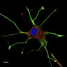 Neurotubules are microtubules found in neurons in nervous tissues.[1] Along with neurofilaments and microfilaments, they form the cytoskeleton of neurons. Neurotubules are undivided hollow cylinders that are made up of tubulin protein polymers[2] and arrays parallel to the plasma membrane in neurons.[3] Neurotubules have an outer diameter of about 23 nm and an inner diameter, also known as the central core, of about 12 nm. The wall of the neurotubules is about 5 nm in width. There is a non-opaque clear zone surrounding the neurotubule and it is about 40 nm in diameter.[3] Like microtubules, neurotubules are greatly dynamic and the length of them can be adjusted by polymerization and depolymerization of tubulin.[4]