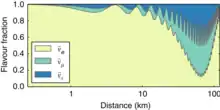 ![]() Electron neutrino oscillations, long range. Here and in the following diagrams black means electron neutrino, blue means muon neutrino and red means tau neutrino.[23] |