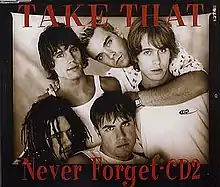 "Never Forget" is a song recorded by English boy band Take That, included as the sixth track on their third studio album, Nobody Else (1995). Written by Gary Barlow, it features Howard Donald on lead vocals. The song was released on 24 July 1995 and became the band's seventh number one on the UK Singles Chart, remaining at number one for three weeks. Robbie Williams left the band during the promotion of the song.