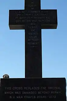 On 22 January 1879, after the disaster of the Battle of Isandhlwana, South Africa, Lieutenant Coghill joined Lieutenant Teignmouth Melvill[2] who was trying to save the Queen's Colour of the Regiment. They were pursued by Zulu warriors, and while crossing the swollen River Buffalo, Lieutenant Coghill (despite his injured knee) went to the rescue of his brother officer, who had lost his horse and was in great danger. Although Coghill's horse was shot by a Zulu warrior, the valiant soldier swam on to rescue Melvill. After some time, the Colour was swept from their grasp and floated down the bank. After reaching the bank, the two men were eventually overtaken by the Zulu warriors and, following a short struggle, both were killed.[3][4] Lieutenant Walter Higginson, who was persuaded to escape, heard and witnessed their final actions when they fought to the last. The Colour was retrieved from the river ten days later by a mounted party under Major Wilsone Black.[5]