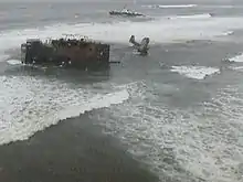 A project to remove the stern by dismantling it on the beach was started in June 2008, after Oregon legislative approval.[14] The dismantling, expected to cost US$18 million, was approved by the State Legislative Emergency Board in September 2006.[15] The move was originally scheduled for 2007, but delays in the negotiations pushed the project back a year. Due to weather and surf conditions, the project had to be undertaken during the spring and summer months.[15] Titan Maritime Company, a subsidiary of Crowley Maritime Corporation, signed a US$16.4 million contract with the Oregon Department of State Lands.[11][16] Titan Maritime used large jackup barges, Karlissa A and Karlissa B, for the New Carissa dismantling project. Once the barges were in place, a cable car system was installed to allow the crews and their equipment access to the barges from the beach.[14] The barges allowed the crews to access the wreck from 40 feet (12 m) above the surf.[14] The crews cut New Carissa into removable pieces and then lifted them to the barges with cranes.[13] The cutting portion of Titan's plan was largely completed by 31 July 2008, and the company then focused on pulling the stern from the sand, a process that was measured in inches.[17][18] The project's managing director expressed confidence that the removal deadline of 1 October 2008 would be met.[14][19] By September 2008, Titan had successfully removed the majority of the wreck; no part of the ship was visible from above the water, and only a few relatively small pieces remained submerged.[20] Karlissa A and Karlissa B were relocated on 12 October 2008, and Titan's shore operations were completely removed by November 2008.[21]